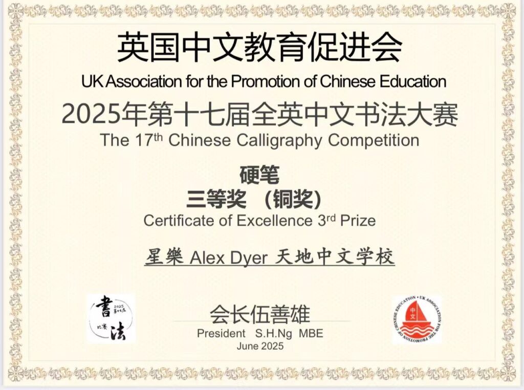 Alex Dyer – Calligraphy/Handwriting Competition (40+ schools, 1000+ entries) won the Third Prize!